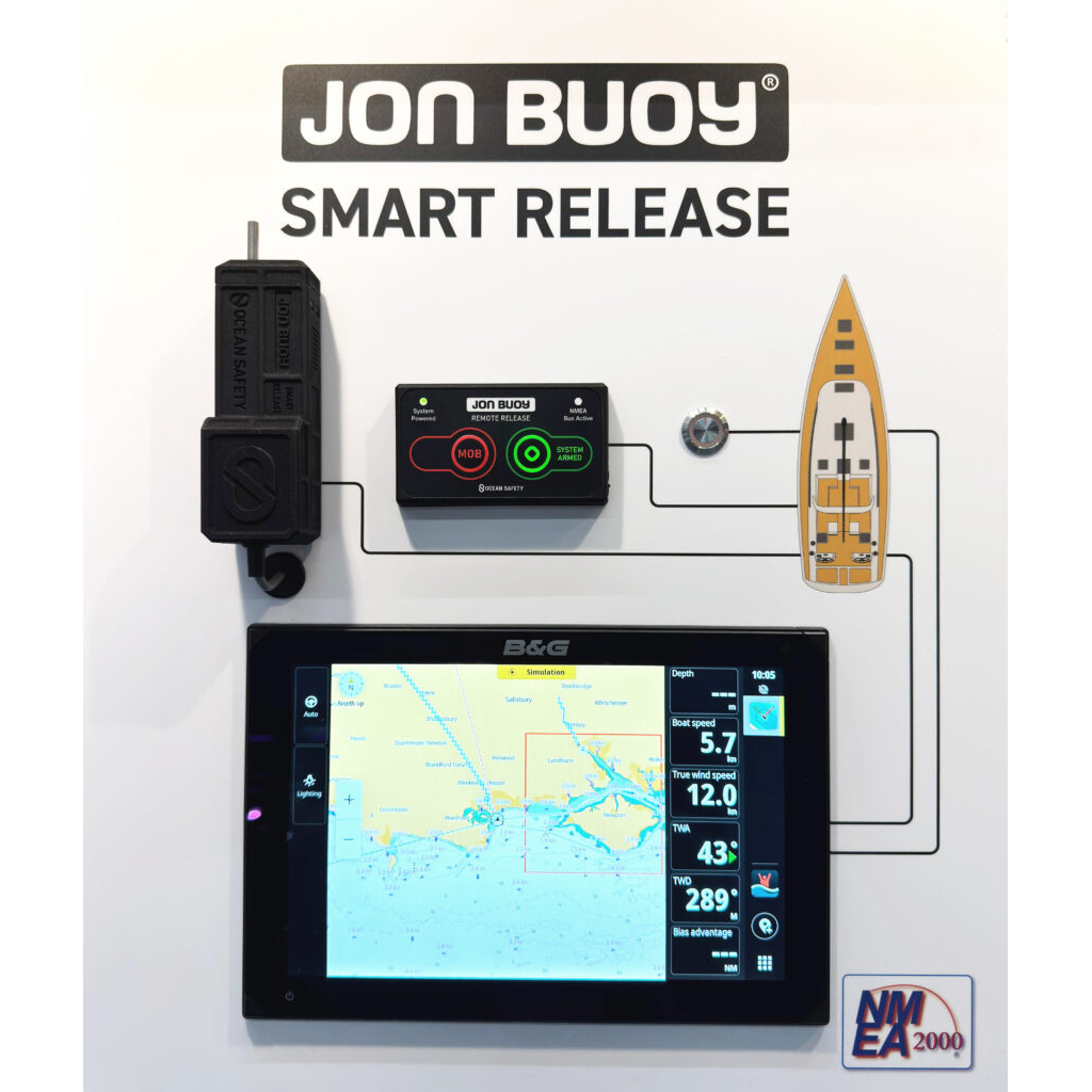 This system enables remote deployment from the bridge or a convenient onboard location, ensuring a swift and controlled release of the Jon Buoy Mk 6 Recovery Module. Uniquely, the Jon Buoy Smart Release is able to fully integrate with the vessels compatible NMEA 2000 network allowing the Jon Buoy Mk 6 Recovery Module to be deployed automatically as part of the MOB process within the vessel’s electronics.
